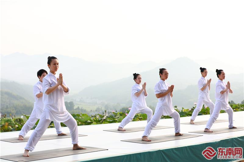 瑜伽表演 肖开涯 摄 本届嘉年华开幕式围绕“建莲文旅康养”主题,依托梯田莲海的壮美景色,打造了一个“百里荷花万顷田,清香如雾绿如天”的唯美卷轴舞台,将建莲文化一一呈现其中。活动通过歌舞、情景秀、瑜伽、骑行等精彩表演,充分展现建宁康养文旅特色。现场观众不仅流连于全国面积最大的梯田莲海,还观看了开幕式文艺表演,尽享建宁生态之美、融合之乐。随着富有地域文化特色的启动仪式开启,更将开幕式现场的氛围推向高潮。