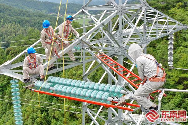 国网三明供电公司输电运检中心带电作业班正在对玉新Ⅰ路#36塔绝缘子缺陷进行带电消除工作。 萧祖玲 摄 东南网6月18日讯(通讯员 蒋俊杰 萧祖玲 江丽霞)连日来,三明市气象部门连续发布高温橙色预警,室外温度高达37℃,地表温度更是超过40℃,居民和企业的降温用电负荷也随之急剧增加,当地供电部门高压带电作业人员持续冒高温、战酷暑,进行高空不停电作业,炎炎夏日为广大群众“送”清凉,确保迎峰度夏期间老区苏区乡村振兴“满格”用电,用行动向建党100周年献礼。 位于将乐、泰宁等两个县城境内的220千伏列新线、池新线、胜饶Ⅱ路、玉新Ⅰ路高压输电线路,承担着当地30余万群众的供电任务。前期,由于雷雨天气,有4处杆塔的绝缘子不同程度受影响,存在安全隐患。国网三明供电公司输电运检中心主任沈明松介绍,由于之前都是雨季,雷雨天气,现场湿度不满足安全开展带电作业条件,加上一些新增雷击的绝缘子缺陷,为圆满完成保电任务,他们抓住机会、抓紧时间,克服高温天气困难进行带电作业。