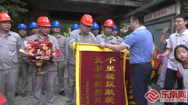 业主们向电力人簇拥而来,为心中的“电力英雄”送上锦旗。陈文鑫 摄 东南网7月29日讯(通讯员 吴玲 陈文鑫 郭志宏 文/图)“谢谢你们,我们终于来电了。”7月27日傍晚,抑制不住激动的心情,家住郑州市天下城小区的刘大姐紧紧握住国网福建电力支援抢修队员的手,眼角泛着感动的泪。伴随着《我和我的祖国》的歌声,涌动的人群中不断传来群众的呼唤“你们一定要回来,河南是你们的家,天下城是你们的家!”。这是天下城小区业主自发为沙县区供电公司分队举办的送别会,以表他们对电力人的感激之情。 受持续暴雨的影响,郑州天下城小区已经断电近一个星期了。电梯不能用只能走步梯,家庭用水全靠人扛上楼,加之连日高温天气炙烤,市民的生活着实困窘不易,上千户群众对“电”的渴望十分迫切。