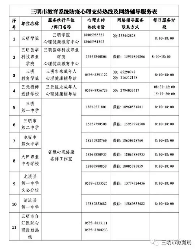 三明市教育局开通防疫心理热线和网络心理辅导服务