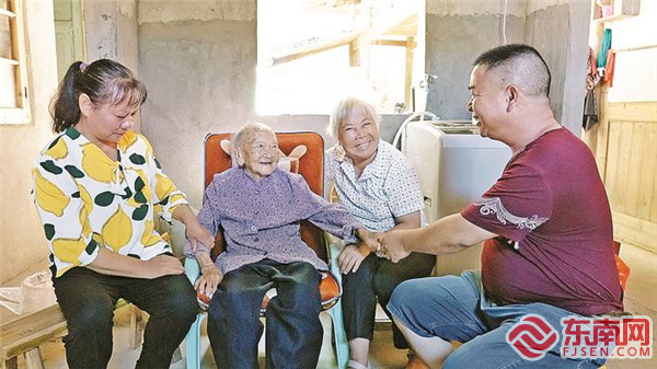 孙子、孙女都非常疼爱老寿星。吴德堋 供图 东南网10月14日讯(通讯员 吴振湖 林婧)“我口袋里的钱票你不敢拿去嘞!”近日,记者见到百岁老人王美英时,老人的大孙媳詹连珠帮她擦完眼后,往她口袋里塞了几张纸巾,她便跟孙媳开起玩笑来,引得众人哈哈大笑。 正所谓,“家有一老,如有一宝”。 家住尤溪县西城镇麻洋村的王美英,出生于1913年5月,今年108周岁,是尤溪目前年龄最长的老人,也是村里“重量级”的老寿星。 王美英3岁就到了庄家,后来成了这家的儿媳妇。刚来时公公已不在世,13岁时婆婆去世了,家庭重担就交到她稚嫩的肩膀上。割猪草、砍柴火……那时王美英什么都要自己干,一天从早忙到晚,但生活依然贫苦,家里一件像样的衣服都没有,见人老远地就要躲开。