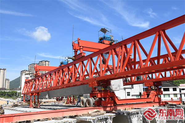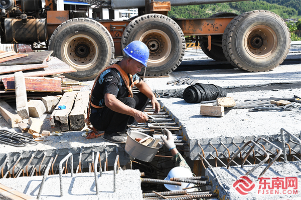 工人顶着高温加紧进行解建1号大桥梁片架设(王琨 摄) 东南网8月27日讯(本网记者 蔡晓卿 通讯员 王琨 严良钤 文/图)省道S215线尤溪联建至玉池公路(联三线尤溪段)作为省、市、县各级“十三五”规划建设重点项目,是尤溪主城区连接西城镇、厦沙高速的重要通道,更是改善群众交通出行、促进沿线经济发展的惠民工程。项目全长2.3千米,依照二级公路标准设计,设计速度60千米/小时,估算投资2.57亿元,主要控制性工程是3座大桥共827.5米。