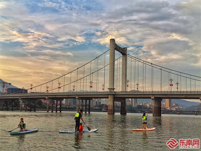 8月8日傍晚,将乐县市民吴先生带着孩子在金溪河练习皮划艇。