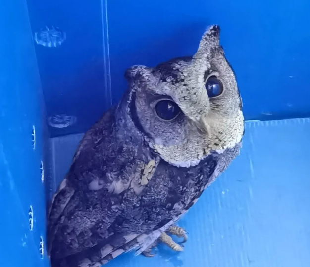 领角鸮 巫先生想起前段时间民警在乡里开展野生动物宣传时,有在宣传单页上看到这只动物。于是立即将受伤的领角鸮带到里田派出所寻求救助。 民警将这只受伤的领角鸮带到派出所内,并在第一时间联系了县局森林警察大队民警,并用保温箱将领角鸮装好,防止挣扎时二次受伤。