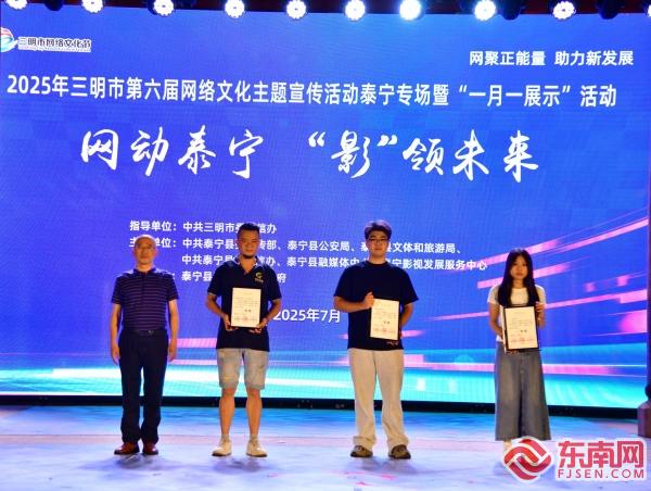 本次活动经评审组严格评审,最终评选出“网动泰宁 ‘影’领未来”影视拍摄作品一二三等奖作品各一件。活动现场,对前三名优秀作品进行了展播,让观众近距离感受优秀网络文化作品的魅力。其中,福建艺术职业学院团队的《青檐叙语》摘得桂冠,泰宁男歌旅拍工作室的《链接陷阱》斩获第二,长安大学制作的《小池潭记》荣获第三名。