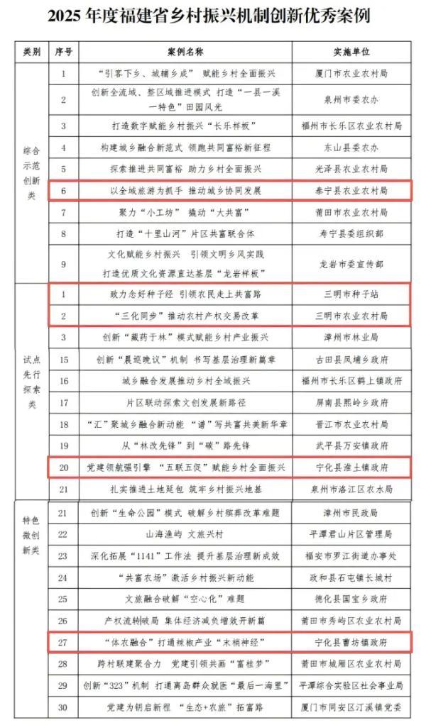 东南网9月26日讯 近日,中共福建省委农村工作领导小组办公室公布了2025年度福建省乡村振兴机制创新优秀案例名单,三明市5个案例成功入选。 此次入选案例涵盖“综合示范创新”“试点先行探索”“特色微创新”三类,充分展现了三明市在乡村振兴机制创新方面的积极探索与显著成效。三明市农业农村局先试先行,积极探索新发展模式,种子站专注种业发展,致力念好种子经,为农民增收致富开辟新路径;经管站以“三化同步”推动农村产权交易改革,助力农村产权交易更加规范、高效,激活农村发展新动能。此外,泰宁县“以全域旅游为抓手推动城乡协同发展”、宁化县曹坊镇“‘体农融合’打通辣椒产业‘末梢神经’”等案例,也从不同角度为乡村振兴提供了创新思路和实践样板。 |