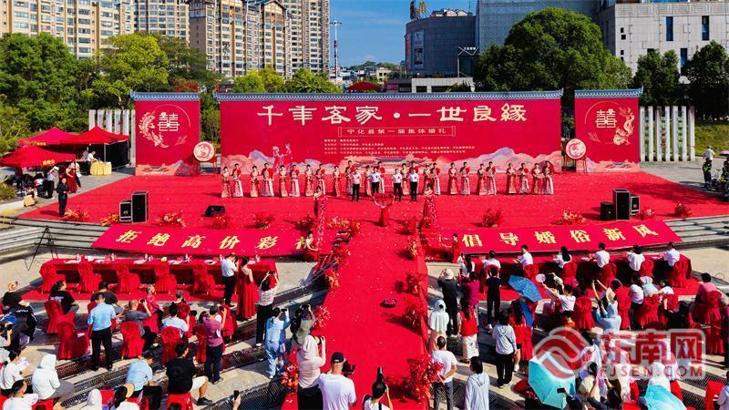 本次集体婚礼深度融合客家“耕读传家、崇文重礼”的文化精神,结合新时代婚俗改革导向,将宁化客家婚俗、婚宴食俗及非遗元素融入仪式全程,打造出一场既有文化底蕴又具时代气息的现代集体婚礼,让新人与现场观众沉浸其中,感受归属与共鸣。