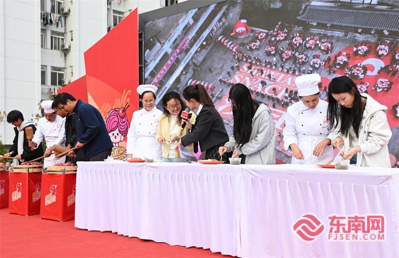 让更多师生了解沙县文化、喜欢沙县小吃是这次活动的目的。活动特别设置了小吃制作互动体验区,邀请学生参与手打扁肉大比拼。“用木槌反复捶打猪腿肉上千次,是沙县扁肉Q弹的诀窍,也是沙县小吃‘千锤百炼美食’的由来。”扁肉技艺传承人王盛滨边演示边介绍,一招一式尽显匠心,吸引着众多学生踊跃参与。而充满趣味的皮蛋扁肉制作环节,则将两地家常滋味相融合,一口尝尽两地鲜,解锁舌尖上的巧思与惊喜。