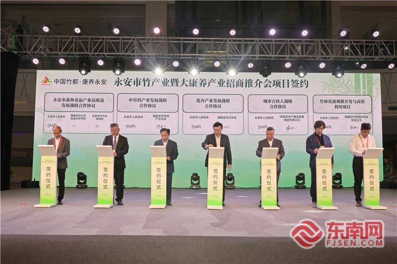 项目签约环节,围绕森林食品、中草药、花卉等产业,永安市人民政府与福建农林大学食品科学学院、永安市竹产业研究院及福建省中药材产业协会、福建省花卉协会分别签订产业发展战略合作协议,并与绿城房地产建设管理集团有限公司签订城市合伙人战略合作协议,与福建阳竹新材料科技有限公司签订阳竹科技竹林资源规模开发与高效利用项目合作协议,多方携手共筑永安生态产业高地。同时,永安市智能化生态康养示范区项目、青水畲寨森林康养基地项目等10个招商项目进行集中签约,为永安竹产业与大康养产业蓬勃发展注入强劲动能。