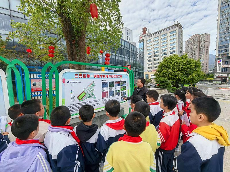 活动现场,师生们参观海绵工程展板。 本次活动为师生们精心打造了一堂兼具知识深度与实践广度的海绵城市科普课。三元区第一实验学校的海绵化改造工程成为“鲜活教材”。 现场工作人员介绍,改造前,学校活动部分场地存在积水问题,绿地土壤裸露,活动空间匮乏,景观环境亟待提升。改造后,有效消除了积水点,消除了潜在的安全隐患与卫生隐患,拓展了师生活动空间,提升了学校生态环境质量。