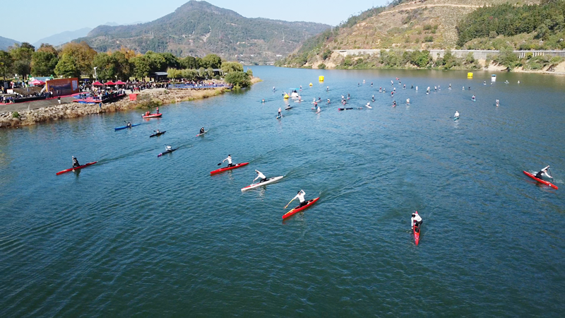 比赛当日,天朗气清,金溪碧波荡漾。随着发令枪响,运动员们挥桨竞渡,一艘艘皮划艇如离弦之箭,在清澈的水面上划出长长的波纹。选手们矫健的身影与两岸连绵的青山、茂密的森林、飞翔的白鹭构成了一幅动感十足的生态画卷。