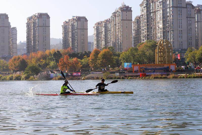 运动员们在碧波荡漾的金溪上劈波斩浪。