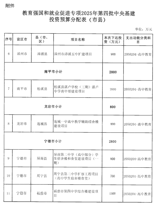 东南网12月1日讯 近日,福建发布通知下达多项中央资金,三明获教育强国和就业促进专项2025年第四批中央基建投资预算3800万元,其中,沙县区1500万元、将乐县2300万元。