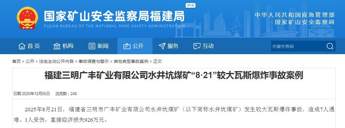 2025年8月21日,福建省三明市广丰矿业有限公司水井坑煤矿(以下简称水井坑煤矿)发生较大瓦斯爆炸事故,造成7人遇难、1人受伤,直接经济损失926万元。 一、事故基本情况 水井坑煤矿为国有控股企业,隶属福建省能源石化集团所属永安煤业公司管理,设计生产能力15万吨/年,低瓦斯矿井。 事故发生在矿井三采区+180米区段,该区段布置+180mC39N运输巷、+180mC39S运输巷两个掘进工作面。2025年3月,+180米区段开始掘进,掘进至205米处遇39#煤,破碎冒顶,形成体积约2.83立方米的高冒区。2025年7月11日,开始掘进+180mC39S运输巷,掘进至15米时,遇煤层赋存条件变化,顶煤冒落,于7月20日停工退出。8月19日,该矿再次安排班组到+180mC39S运输巷处理冒顶和清理冒落浮煤。 二、事故直接原因 三采区+180mC39S运输巷掘进迎头煤层赋存条件变化,煤层变厚、倾角变大、煤细碎松软,浮煤边清边冒,瓦斯持续涌出并在迎头高冒区大量聚集,且与紧邻的+180米石门高冒区溢出瓦斯汇聚,风量不足导致瓦斯积聚达到爆炸浓度,爆源区域内作业人员打火抽烟引发瓦斯爆炸。 三、事故暴露的主要问题 (一)水井坑煤矿。一是瓦斯防治措施落实不到位。对瓦斯风险认识不足,事故工作面未安装甲烷传感器,存在瓦斯假检漏检现象。二是区段通风管理不到位。区段通风布局不合规,区段回风不通畅,掘进工作面风量严重不足,新增工作面未测风、未安装监测监控设备。三是违规安排采掘计划。盲目安排布置掘进作业,未实现超前两个区段联通,违规组织作业,未按规定编制作业规程。四是现场安全管理混乱。事故当班井口检身漏检,部分入井人员未随身携带人员定位卡,工人井下违章使用明火,随意使用非防爆角磨机。五是安全教育培训不到位。对工人培训考核直接发参考答案,部分特种作业人员无证上岗。 (二)上级公司。永安煤业公司对水井坑煤矿“一通三防”工作失管失察,技术指导不到位,未及时掌握矿井新增工作面情况,未及时发现水井坑煤矿不按规定编制作业规程、工作面未安装监控系统、工人井下违章吸烟、井下随意使用角磨机等问题。福建省能源石化集团推动两办《意见》“八条硬措施”和治本攻坚三年行动等工作不力,对煤矿“一通三防”工作重视不够。 (三)地方政府及监管部门。地方安全监管部门对瓦斯爆炸风险认识不足,未研判瓦斯爆炸系统性风险,对水井坑煤矿存在的井口检身、现场管理混乱等问题失察;地方政府对煤矿落实两办《意见》等重点工作监督指导不够,对煤矿安全监管部门监督检查不到位。 四、调查处理情况 对31名相关责任人员提出追责问责建议。其中广丰矿业公司董事长、经理兼水井坑煤矿矿长、广丰矿业公司党支部书记、副经理兼水井坑煤矿安全副矿长等2人已由公安机关立案侦查,广丰矿业公司副经理兼水井坑煤矿总工、广丰矿业公司副经理兼生产副矿长、水井坑煤矿采掘队长、当班检身员等4人建议移送司法机关追究刑事责任,撤销水井坑煤矿矿长、总工、生产副矿长、安全副矿长、采掘队长等5人执业资格,水井坑煤矿矿长自其刑罚执行完毕之日起,5年内不得担任任何生产经营单位主要负责人,合计处其上一年度收入的130%行政罚款;对大田县政府时任副县长、县工信局、煤管局有关负责人、永安煤业公司董事长、总经理等25人分别给予行政处罚、党纪政务处分或组织处理。 对水井坑煤矿处以罚款192.5万元,暂扣安全生产许可证。责成福建省能源石化集团向福建省政府作出深刻检查。责成大田县政府、三明市工业和信息化局(煤管局)向三明市政府作出深刻检查。 |