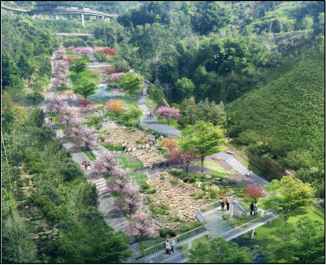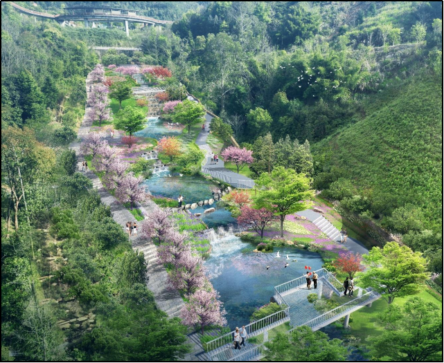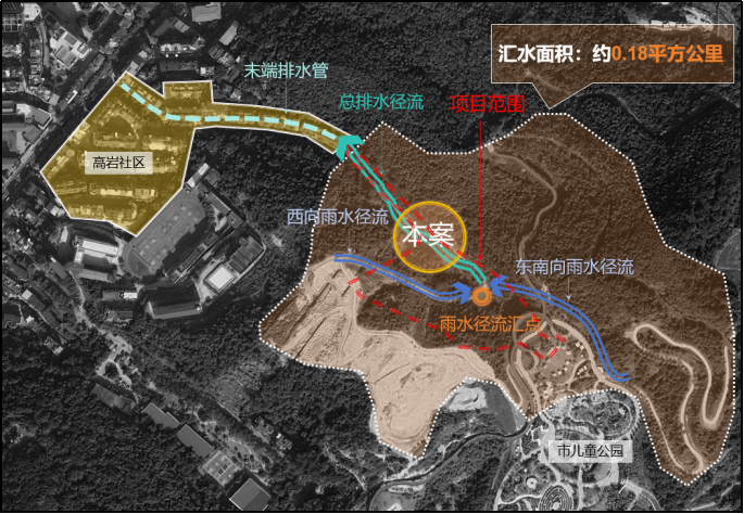 一、项目概况 高岩社区内涝治理工程项目位于三明市三元区列东街道,坐落于高岩社区以东、市儿童公园以西的一处山谷绿地,总建设面积14670平方米。建设地块的高程落差约70米,总汇水面积约0.18平方公里。山谷上游山高坡陡,大雨时洪峰形成快,水势迅猛,部分山地植被破坏严重,导致雨洪携带大量泥沙枝叶冲击高岩社区,而社区雨水管扩建受限,引发社区道路淹没、泥水横流,威胁居民安全。此外,原山谷绿地因生态功能弱化、慢行系统单一、休憩设施不足,造成空间生态及景观品质低下。 高岩社区内涝治理工程项目的建设通过分级滞蓄、多元海绵设施集成和生态空间重塑,重点调控削减洪峰流量,并结合多功能开放绿地空间的创建,实现山谷空间从“洪患山涧”到“韧性绿谷”的生态蜕变,为山地城市的海绵化改造提供标杆性实践。