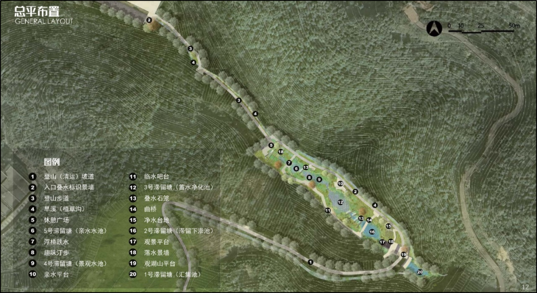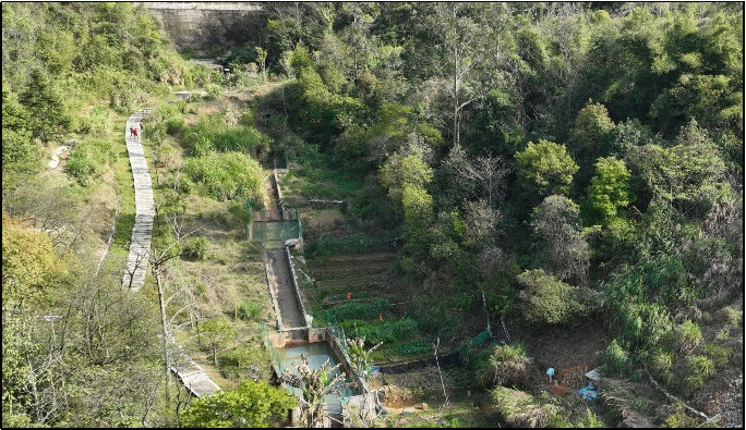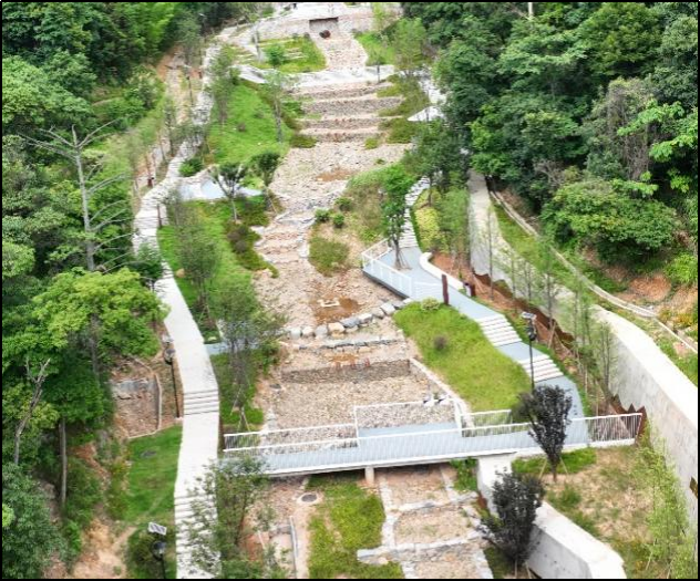 高岩社区内涝治理工程项目总平面图 二、主要成效 1.安全韧性提升。项目建成初期,三明市城区遭遇“2025.04.24”暴雨,1小时降雨量达64.8毫米(重现期21年一遇),2小时降雨量达81.3毫米(重现期28年一遇),高岩片区山洪经海绵公园的多级蓄滞系统调控削峰后,下游社区路面漫溢的雨洪量显著降低,基本无泥沙进入社区,未影响居民正常出行。 2.生态环境增益。生态滞留塘、生态草沟等海绵设施有效减少水土流失,降低面源污染,改善水环境。数十种乡土植被吸引鸟类、昆虫栖息,生态多样性显著提升。 3.社会效益凸显。通过旱溪、生态滞留塘等海绵设施打造亲水空间,将洪患山涧蜕变为居民观景、休息的静谧场所和韧性绿谷,重建人与环境、人与水的自然和谐纽带。