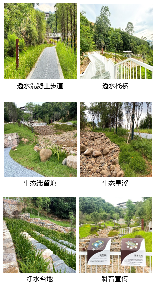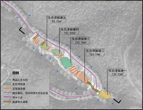 高岩社区内涝治理工程项目汛期效果图 三、主要做法 1.雨洪调控破解山地洪患难题 (1)源头减排,消纳本地雨水。场地布置透水铺装、生态草沟、净水台地、植被缓冲带等海绵设施,构建“源头减量-过程缓释”的雨水消纳净化系统。 (2)分级蓄滞,调控客水削峰。改造原有混凝土沉沙池,结合山谷地势70m落差布置五级生态滞留塘,对上游客水雨洪进行分流、蓄滞,实现小雨边沟慢排,大雨蓄滞削峰,并通过逐级滞蓄雨水、沉淀泥沙,化解陡坡径流冲击,实现对洪峰流量的错峰调控、削峰延时。