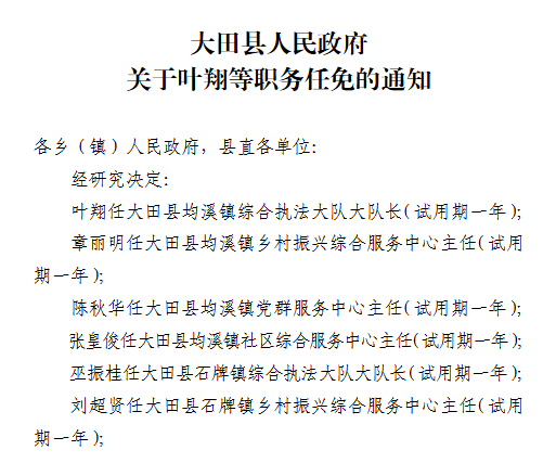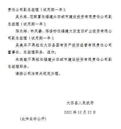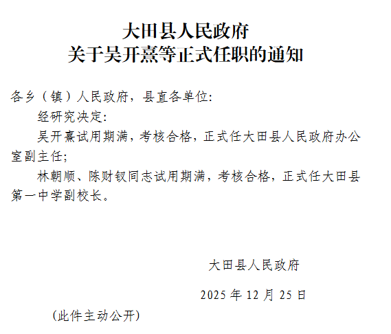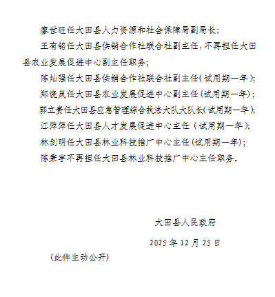 东南网1月6日讯 近日,三明大田县发布一批人事任免,一起来看——