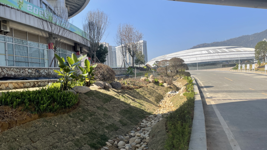 针对场馆周边硬质铺装破损、易积水等问题,将海绵理念与体育健身功能有机融合。