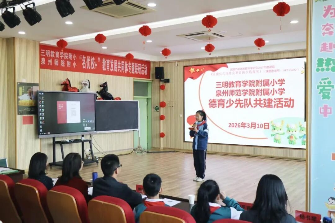 三明教育学院附属小学与泉州师范学院附属小学举行少先队共建交流活动。 下一步,三明教育学院附属小学将持续深化课题研究,以升旗仪式为核心场景,联动更多共建单位,拓展山海协作内涵,丰富场景化德育载体,让爱国主义教育、文化传承教育、协作共进教育更有温度、更具实效,培育担当民族复兴大任的时代新人。(三明教育学院附属小学供稿) |