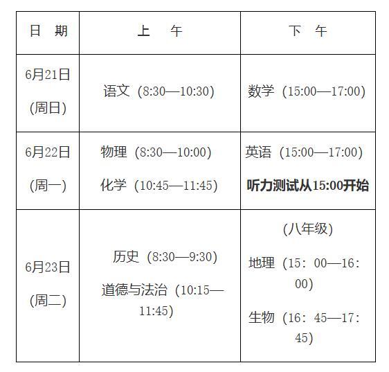 (三)考试(测试)科目分值 语文、数学、英语考试各150分,道德与法治、历史、地理、物理、化学、生物满分各100分,体育与健康40分。 (四)考试(考查、测试)时间安排 各学科考试时间安排如下: