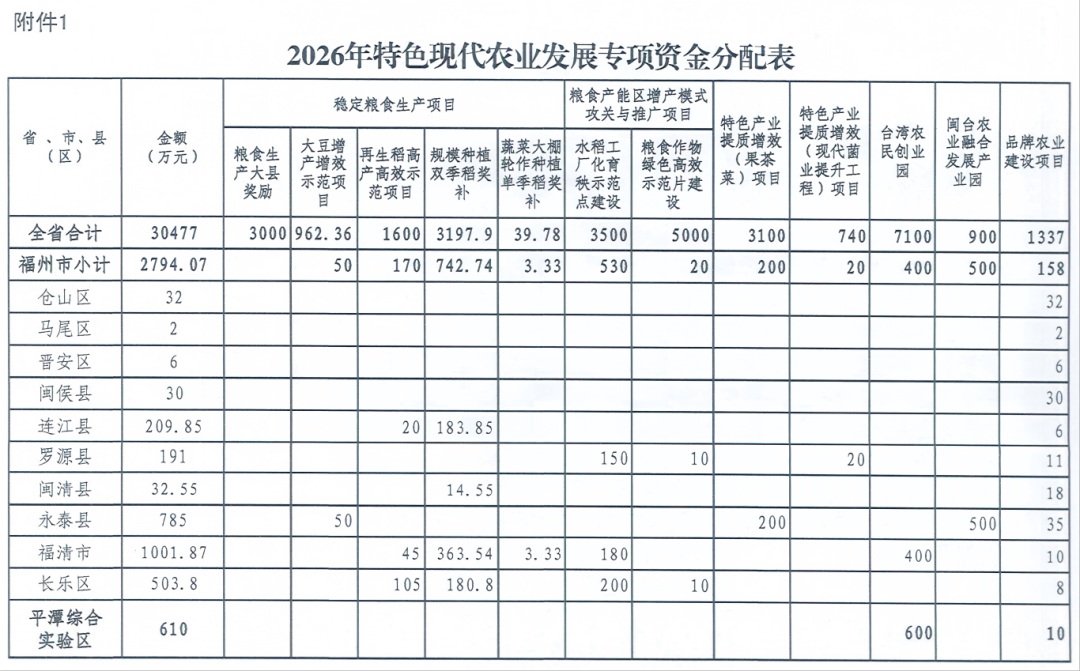 东南网4月13日讯 近日,省财政厅和省农业农村厅联合发布了关于下达2026年特色现代农业发展专项资金的通知。经研究,现下达2026年特色现代农业发展专项资金30477万元,其中三明市获得5547.86万元专项资金。