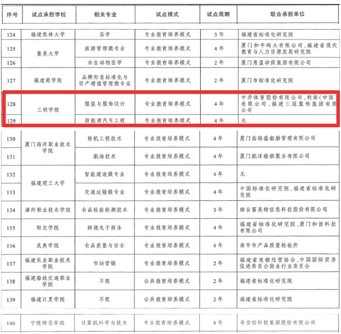 东南网4月22日讯 4月21日,国家市场监督管理总局、教育部联合印发《关于公布专业与标准化教育融合试点名单的通知》,全国共281个试点项目入选。其中覆盖福建多所高校,三明学院2个专业入选,分别是服装与服饰设计、新能源汽车工程。 专业与标准化教育融合试点名单 (福建部分)