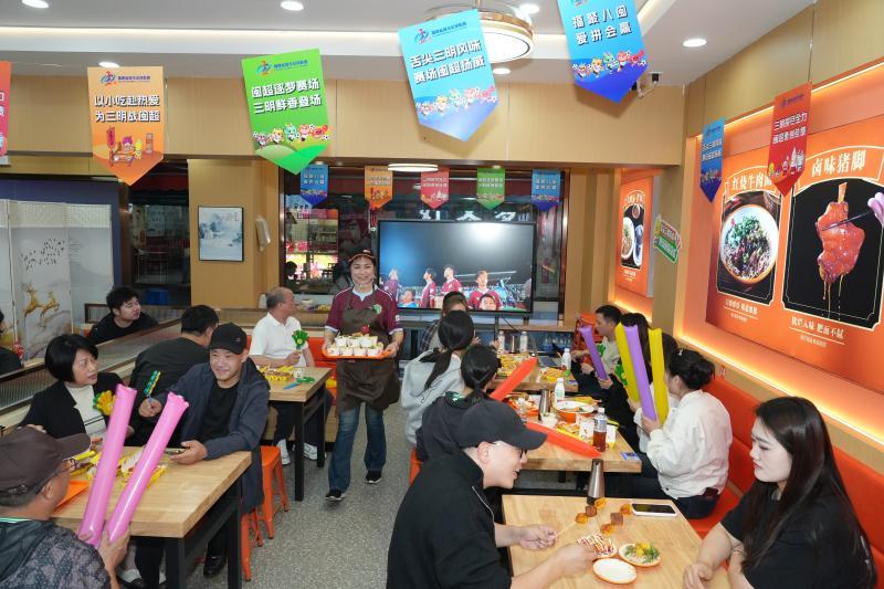 食客们边品尝沙县小吃,边看“闽超”。受访者供图