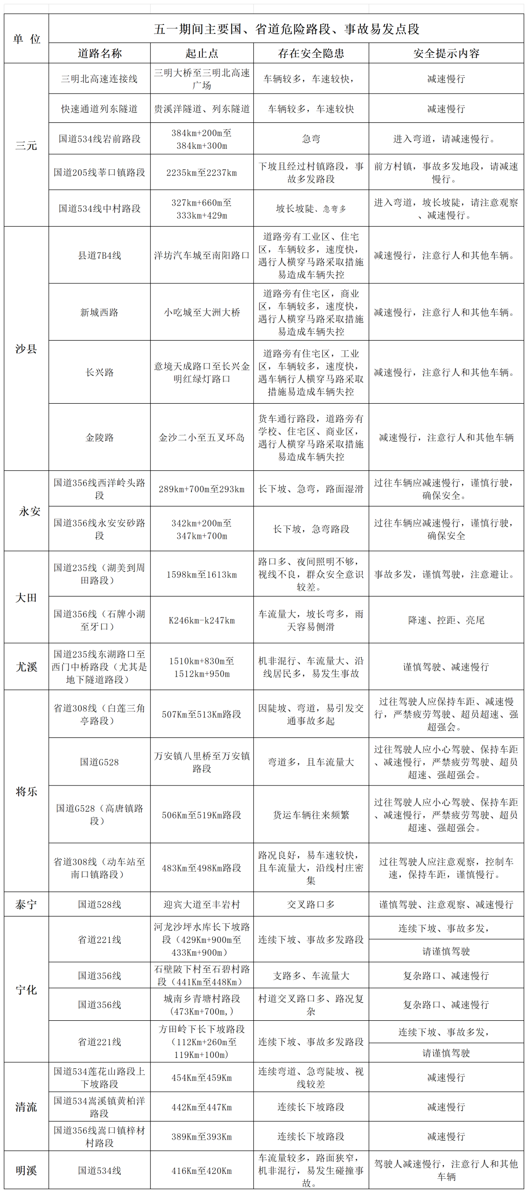 东南网4月27日讯 “五一”小长假即将到来,群众旅行出游集中,届时将迎来车流、人流高峰。为保障节假日期间,辖区道路交通安全,三明公安交警结合辖区实际情况,发布2026年“两公布一提示”,提示广大交通参与者合理选择出行时间路线及方式安全、文明出行。 三明市道路情况预判分析 2026年“五一”放假时间为5月1日至5月5日,放假期间,高速公路小轿车全部免费通行。群众出行需求集中释放,长途旅游、近郊踏青、自驾出行、探亲访友等交通流交织,全市各相关道路人流、车流相较往年呈现上升趋势,全市域内休闲旅游景点、乡镇农庄休闲活动、商业繁华场所较为集中的区域以及连接高速收费站的交通流量将大幅增加,道路交通安全风险加大。请广大交通参与者及时关注交通安全相关信息、资讯,合理安排出行时间、路线、方式,尽量避开出行高峰和易拥堵路段,严格遵守道路交通安全法律、法规,谨慎驾驶,平安出行。 五一期间主要国、省道易拥堵路段