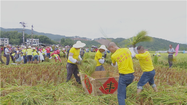 割稻子比赛现场 在活动现场,主办方还安排了丰收节趣味农耕活动,割稻子、徒手抓鱼、拔河等比赛“农味”十足,妙趣横生,充分展示了当地特色的农耕文化及风土人情,吸引了近百名游客前来观光和体验。