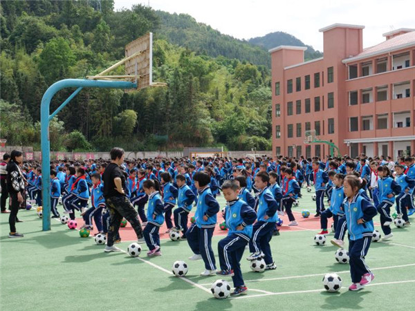 小学生认真做起足球操 东南网4月25日讯(通讯员 杨颖 温玉婷 文/图)“踩球、颠球、传球……”4月21日,在三明市清流县嵩口中心小学的操场上,随着广播音乐的响起,600余名小学生跟着节拍,认真做起足球操,孩子们自信活泼的表现成为学校一道亮丽的风景线。据悉,这套约20分钟的足球操是由该校体育老师自编自创,取代了传统的课间操,大胆融入足球元素,场面壮观,有趣易学,受到孩子们的喜欢。 “我们现在做的是自己编的第二套足球操,主要包括头顶球、膝顶球、拉球……”体育老师林彩云说,作为一所乡村学校,嵩口中心小学把足操融入课间操,进行大胆创新,运用系统的科学训练方法,从小培养学生们热爱体育的习惯,得到了众多家长和老师的肯定。在2017年福建省小学生校园足球比赛上,嵩口中心小学更是一举夺得三明赛区二等奖的好成绩,同年,这个学校还被评为国家级足球特色校。