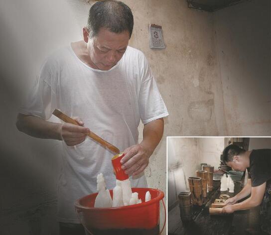 上色 三明非遗糖塔制作工艺流程 (吴光添 摄) 罗榕华 七夕是传说中牛郎织女鹊桥相见的日子,后来泛指有情人浪漫相聚的一天,被人们视为“中国情人节”。在沙县,七夕却有另一种演绎和身份,那就是要给新入学孩子举行特别的入学仪式——做七夕。可以说,农历七月初七是沙县及沙溪河流域的民间儿童节。 做七夕——独特的入学仪式 农历六月中旬,沙县许多人家的外公外婆们忙碌了起来,开始给即将上学的孙子孙女们筹备做七夕的礼物。在所有礼物之中,糖塔必不可少的,它是沙县做七夕最具代表性的礼品。 沙县人口中的“糖塔”指糖塔和糖俑的合称。做七夕的人家一般需要采购“糖塔”两组,其一为福禄寿三星俑,喻示有福、有禄、有寿。其二为糖塔、鳌鱼俑、拜朝俑和麒麟俑。鳌鱼俑为米佣,意出自“鲤鱼跳龙门”。拜朝俑是持笏的文官,以示“仕途高远”。麒麟俑则寓示“太平长寿”。 到了做七夕当天,有孩子要上学的家里都布置得喜气洋洋,神台上供满了各种摆件。每样摆件都有其特殊寓意:旗杆斗是“三元及第”(中举一斗,进士两斗,一甲三斗)的象征。糖塔高约一尺许,中间空,头套红纸花,用白糖溶化灌注而成。外形酷似西安大雁塔,取意“雁塔题名”。唐代凡新科进士及第,都要游曲江宴杏园,后登临大雁塔,题名塔壁留念。当年27岁的白居易入籍进士,写下了“慈恩塔下题名处,十七人中最少年”的诗句。刘沧更是豪迈地题下“及第新春选胜游,杏园初宴曲江头。紫豪粉壁题仙籍,柳色箫声拂玉楼”,把雁塔题名与登仙并提,视作莫大荣誉。 沙县自古有三登科的说法,即科举高中为大登科,娶妻结婚为小登科,七夕上学则为小小登科,所以沙县人十分重视做七夕仪式。 做七夕通常是外公外婆的主要任务。古时候富裕家庭会请私塾先生七夕当日来当家教,以示重视。现在有些家庭“具体化”模仿,请学校的教师来家一天指导“新生”读书写字。仪式后,糖塔糖俑要敲碎(岁岁平安)杂在爆米花里分成小包,贴上一方红纸送给亲戚朋友左邻右舍,让大家分享甜蜜与快乐。同时也是一种通报,告诉众人:我家孩子初长成,今年秋季就要上学了! 糖塔——古老技艺的传承 伴随沙县做七夕的独特传统,留存下来的还有糖塔制作技艺。年过花甲的沙县人梅增寿从17岁开始学做糖塔,他有40多年做糖塔经验。他说制作糖塔是个精细的活儿,考验的是耐心和技巧。从白糖到糖塔主要经过清洗模具、选糖、熬糖稀、浇注、冷却、出模、桶装、上色等几个步骤。 一是清洗模具。糖俑的模具在制作前一夜被梅师傅“请”了出来。梅师傅小心翼翼地用净水清洗,而后投进水缸中浸泡一夜,待模坯吸足水分,再把它们捞出搁一旁的横板上沥干备用。 二是选糖。制作糖塔的白砂糖纯度要求很高,并不是普通的“柴糖”可以代替的。白砂糖是做糖塔的重要原料,它的优劣决定糖塔的品质。 三是熬糖稀。梅师傅将优质的散装白砂糖倒进圆桶里,再用铁勺把白砂糖舀进手持小锅,小锅添加泉水,不多不少一两勺正好。手持小锅有两个,一个铜锅一个铝锅,轮换使用,那是梅师傅的爷爷与父亲辈使用过并遗留下来的,两口锅的岁数均超过梅师傅的年纪。盛满白砂糖和泉水的手持小锅被梅师傅轻巧地放置在简易炉头上,白砂糖在火力的作用下,开始溶解,不久,砂糖粒化成浆水。熬糖浆温度要100℃以上,梅师傅有一套自己的经验,他控制糖浆完全靠肉眼观察。他判断糖浆“熬好”最直观的方法就是糖浆水起“糖花”,熬好的糖浆水叫糖稀,一旦那些白砂糖熬成糖稀,冒出欢快的糖花泡时,就说明糖稀已经可以浇注了。 四是浇注。熬煮好的糖稀不能马上倒进模坯中,要先放置一旁冷却至40℃左右,冷却过程中用平木勺不断搅动降温,凭梅师傅经验,糖稀泛白就可以开始浇模了,一锅糖稀够浇三五个模具。浇模是一项技术活,要求手、脚、眼快速配合,灵活机动才能天衣无缝。梅师傅是个浇模高手,从提锅到三五个模具浇灌完毕,两分钟内他一气呵成,动作准确干净利落。糖稀在梅师傅浇灌下,在模具内高速注满,锅内剩余的糖稀又“哧溜”一个急转身,流回糖锅,接着依次倒进下一个模具,模具的樟香与糖香在作坊内升腾……老话说“一分技艺,十分汗水”,要想把糖塔糖俑浇注得厚薄均匀、平整密实,功夫就在这几分钟内。对技艺娴熟的梅师傅而言,即便偶有闪手也不打紧,趁糖稀还没固化,从容不迫添浆修补,照样可以完美收官。农历六月正是夏日里最热的时节,做糖塔有讲究,为了不影响糖稀熬制效果和冷却速度。不能吹风扇,也不能开空调,梅师傅的加工作坊空间不大,通风效果没有那么良好,工夫不大,梅师傅便大汗淋漓。 五是冷却。糖稀的冷却和凝固需要时间,短则四五分钟,长则五六分钟,待那些高温糖稀在模具内冷却凝固成糖塔或糖俑的形状,就可以准备“横空出世”了。 六是出模。出模是精细活,梅师傅灵巧地撸去篾箍,谨慎地掰开木模,一尊尊透亮晶莹的糖塔和糖俑就在他的手中接二连三诞生,它们不但通体馨香,还带着让人惊喜的出生余温。 七是桶装。出模后再冷却至常温的糖塔和糖俑被梅师傅的妻子分类整齐地码在木橱里,统一的模范复制出雷同的款型与式样,一样的等高、一样的表情、一样的装束,阵容强大。 八是上色。一般人家购买糖塔没有要求上色,若有特意交代,则要给糖塔和糖俑上色。给糖塔
