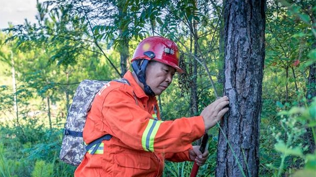 曾显林在进行森林病虫害防治 临近中午,森林里的鸟儿发出叽叽喳喳的声音,曾显林的肚子也开始在叫。但他依旧走得勤,瞧得也细。防火防盗采、森林病虫害防治、制止乱捕乱猎……这些,都在曾显林的巡山清单上。 “新到一批对讲机,请各位护林员今日内到林业站领取试用。”收到一条群消息,曾显林看后有点激动,下山的步伐逐渐加快。 “其实这不是第一次设备扩充,前段时间我们也给22个行政村进行了装备升级,尤其保证了每个村再配两台风力灭火机,前脚刚灭火后脚又复燃的问题得到有效解决。”宁化县石壁镇副镇长丘海腾介绍,这一切都得益于“双网双线”网格化管理的实施,构建起纵向到底、横向到边、全覆盖、无盲区的森林火灾预防格局,取得了良好成效,“我们通过‘双网双线’在高森林火险期开展巡护和宣传,让山有人管、林有人造、树有人护、火有人防、责有人担。”