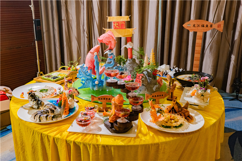 6.银龙游双塔:将安砂盛产的白刀斩杀去骨,切成蝴蝶片,煎好的蛋饼切丝在盘中摆成弯曲游龙状,切好的蝴蝶片中间夹上火腿、香菇,依次码在盘内,蒸6分钟取出,最后用肉汁、淀粉勾玻璃芡浇入,再配以胡萝卜雕成的双塔,这道肉质细嫩Q弹、口感丰富,祈盼风调雨顺、振兴文运的银龙游双塔就完成了。