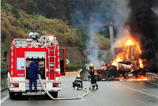 相关部门开展紧急救援 13时54分,现场灭火基本处置完成,在完成事故区域安全布控后,执法人员配合高速交警指挥交通,放行滞留车辆。随后,各部门依据职责分工进行现场路产损坏勘验、拖车、路面清理等后续工作。 经消防部门初步判断,该车的起火点位于左后方轮胎,是爆胎后继续行驶引起的轮胎起火,进而引燃了车辆和装载货物。三明高速执法支队提醒您:行车前务必检查轮胎、制动等车辆状况,防止车辆“带病上路”。 |