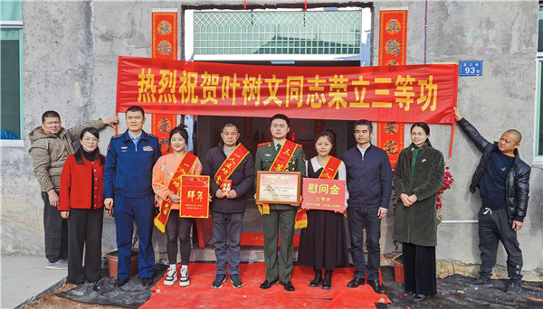 为荣立“三等功”的现役军人叶树文送去立功喜报。 近日,三明市大田县人武部、退役军人事务局联合均溪镇、华兴镇等相关单位为荣立“三等功”的叶树文、周有荣2位现役军人家庭送去立功喜报和慰问金。 家属接过满载荣誉的喜报,喜悦与自豪之情溢于言表,他们真情表达了对党和政府的感谢,并表示将一如既往地鼓励、支持子女在部队安心服役、努力工作、报效祖国,争取再立新功。