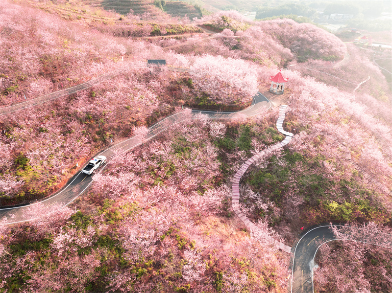 2月26日,泰宁县大田乡百亩樱花盛开,粉色花海如梦如幻。漫山遍野的樱花枝头缀满花朵,吸引众多游客前来观赏。游客们漫步花间小道,或闻香,或拍照,尽情享受春日美好时光。樱花季不仅为当地增添了一道亮丽风景,也带动了乡村旅游的发展,成为春日里的一抹亮色。(张显超 摄)