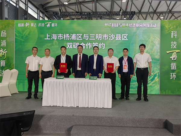 东南网6月6日讯(通讯员 吴伟林 林钐 文/图) 6月5日,在第三届上海国际碳中和技术、产品与成果博览会上,沪明两地政府部门在“杨浦新算法,科技再循环”论坛上完成“双碳”合作签约。