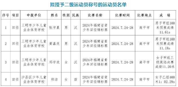 名单公示!三明拟授予这4人二级运动员称号