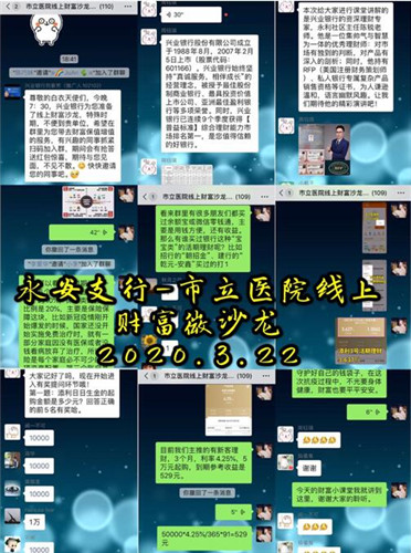 东南网3月25日讯(本网记者 肖晓敏)由于疫情,兴业银行永安支行每月都会举办的理财沙龙不便邀请客户来网点参加,但是该行为广大客户服务的心从未停止。3月22日晚兴业银行永安支行在永安市立医院代发工资群内成功举办了一场别开生面的线上财富沙龙活动。 此次线上沙龙由该行多位工作人员在线上配合进行,活动气氛热烈,获得了永安市立医院工作人员的一致好评。课堂先从简单的几个有奖问答开始互动,继而通过讲解标普家庭资产配置图的四个象限,传递资产配置理念,再介绍该行明星活期理财产品之添利日日生金,和定期理财稳利睿盈年年升供客户参考,并在线解答了客户提出的相关问题。 该行表示,即使在这样的特殊时期,即使有各种各样的困难,兴业银行永安支行也会共克时艰,增强服务。 |